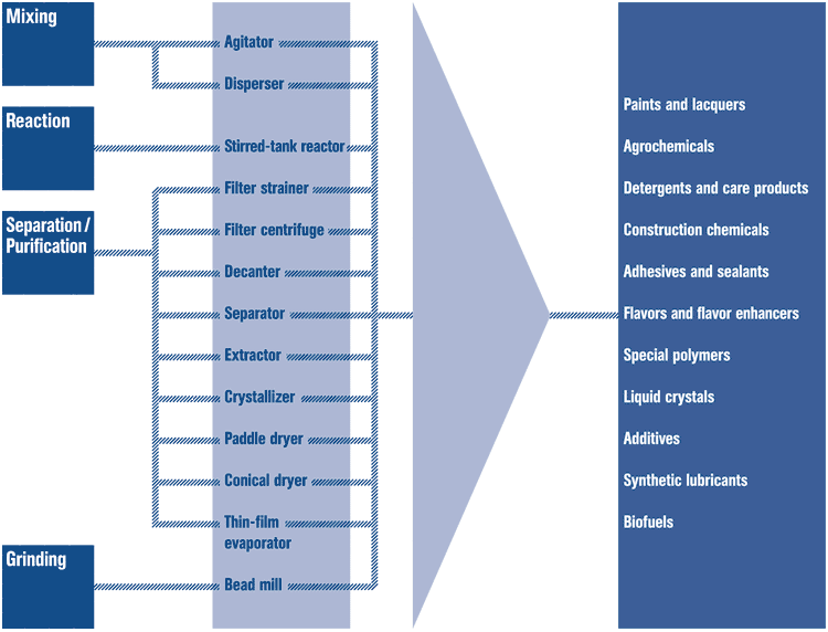 Products in the fine chemical industry are manufactured in discontinuous processes. Successive production steps, such as mixing, reacting, and separating are typical here. Very special chemical substances and products are often manufactured.